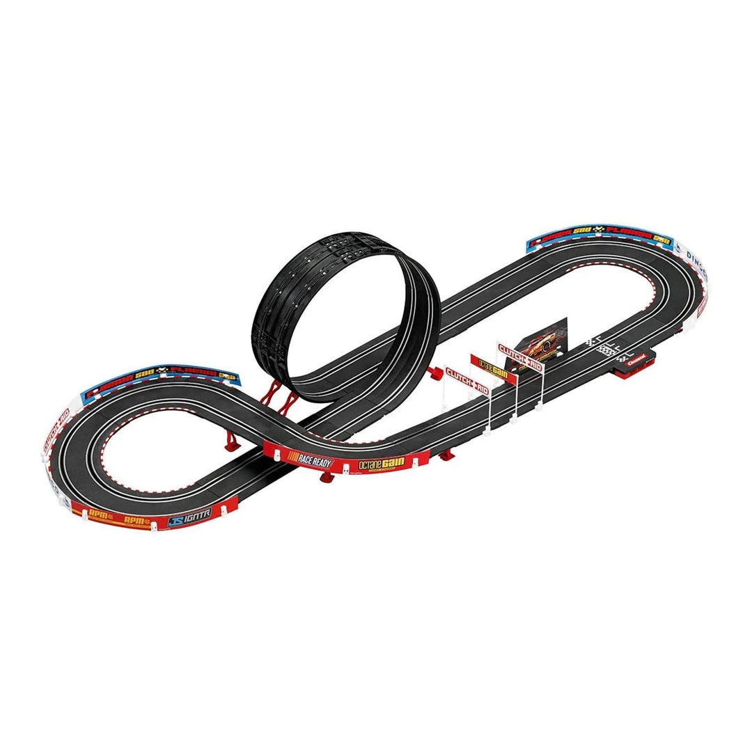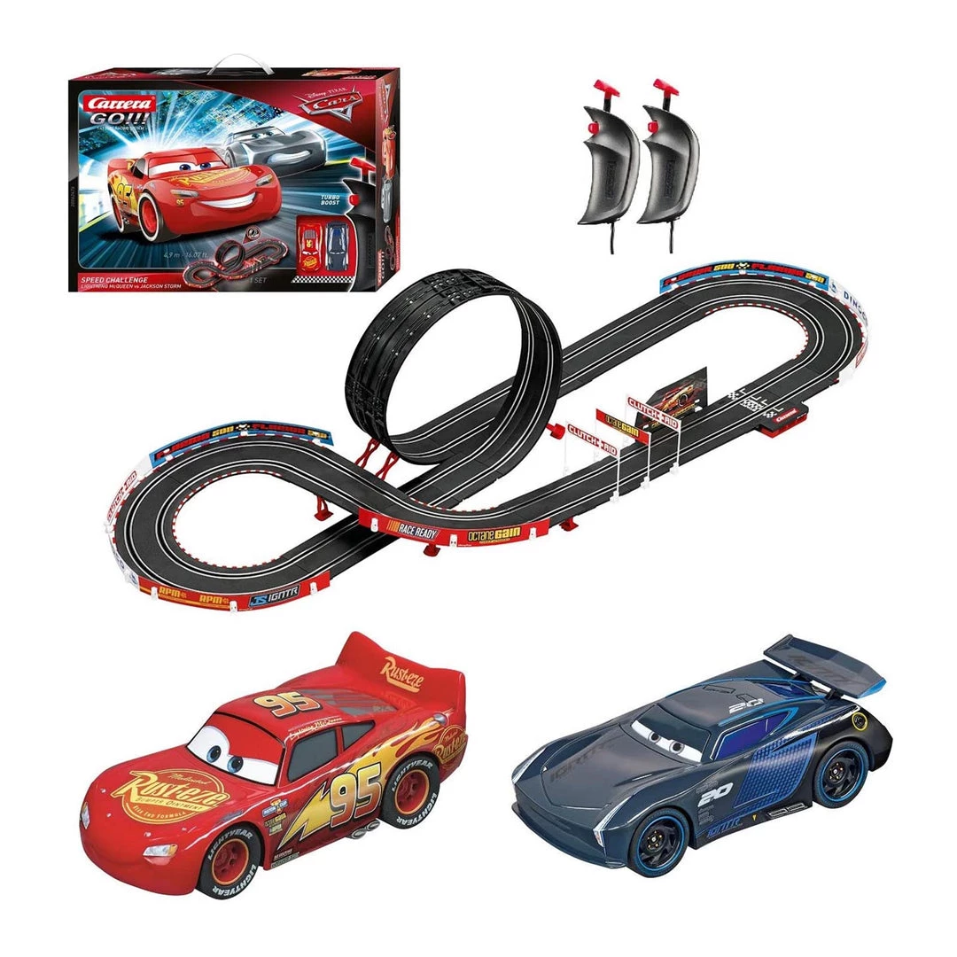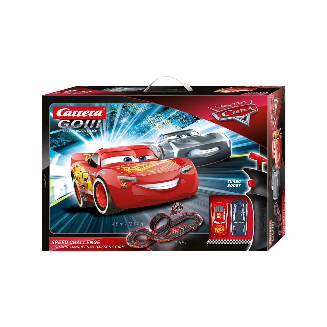 Lightning McQueen and Jackson Storm face off during their next race together right on your Carrera GO!!! race track. The 4.9-metre-long race track on a scale of 1:43 has some adventurous chicanes built in. The route leads you and your opponents through several corners and even through a loop section.