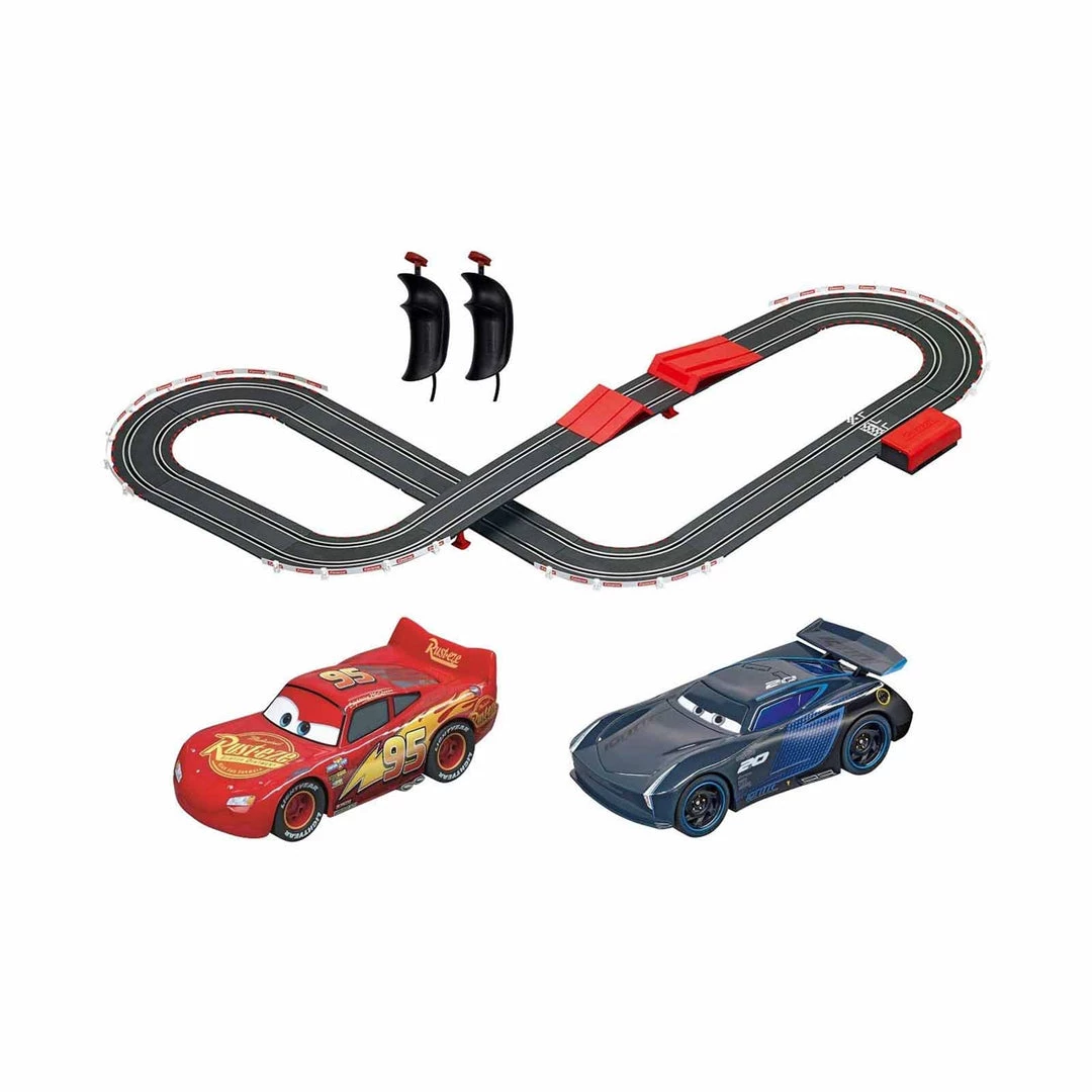 This is a Carrera GO Disney Pixar Cars Lightning McQueen Vs Jackson Storm 1:43 Slot Car Racing Set made by the good people over at Carrera.