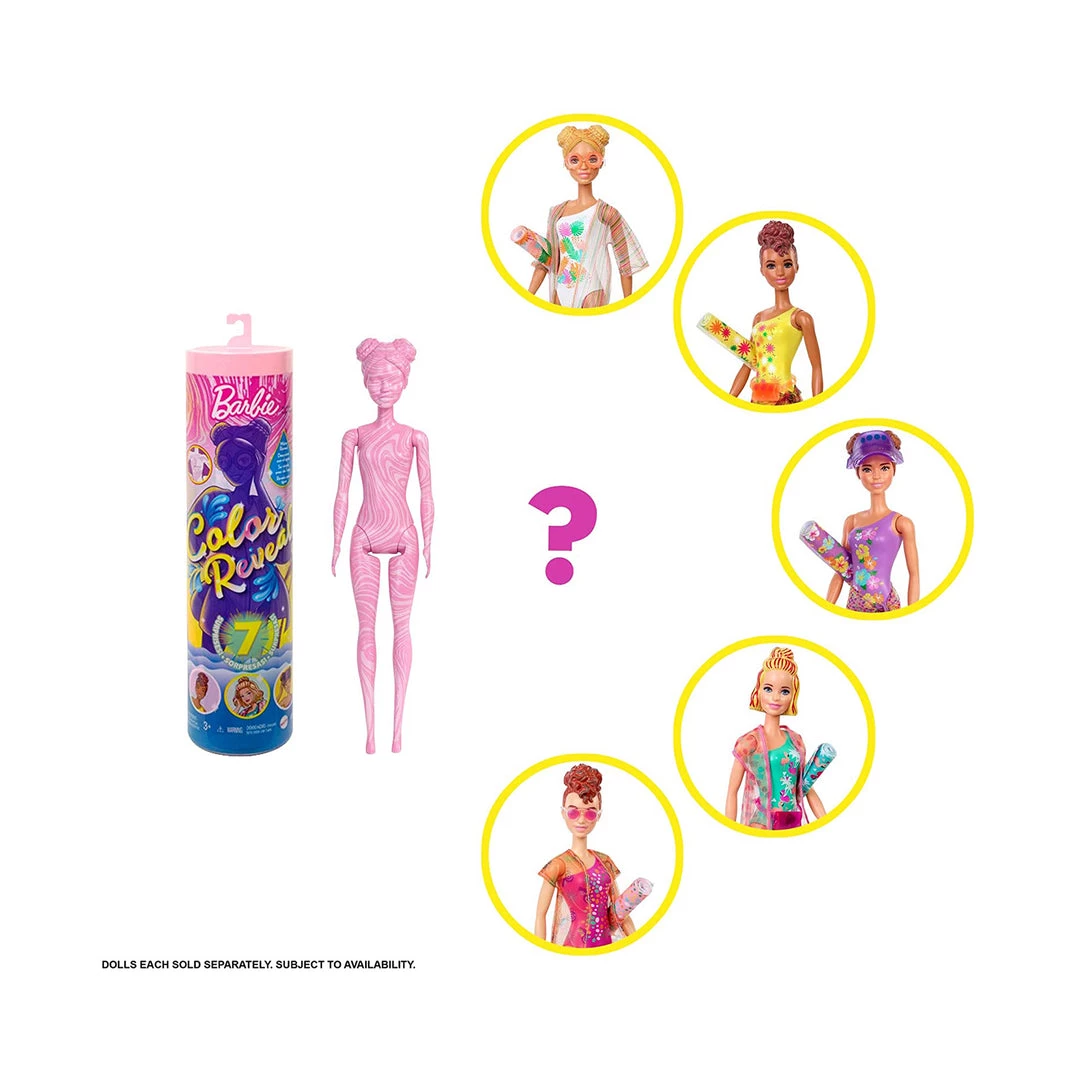 Swirl this Barbie in warm water to reveal its fun look! With 5 surprises in 1 package, the Barbie Color Reveal dolls deliver all kinds of delight.