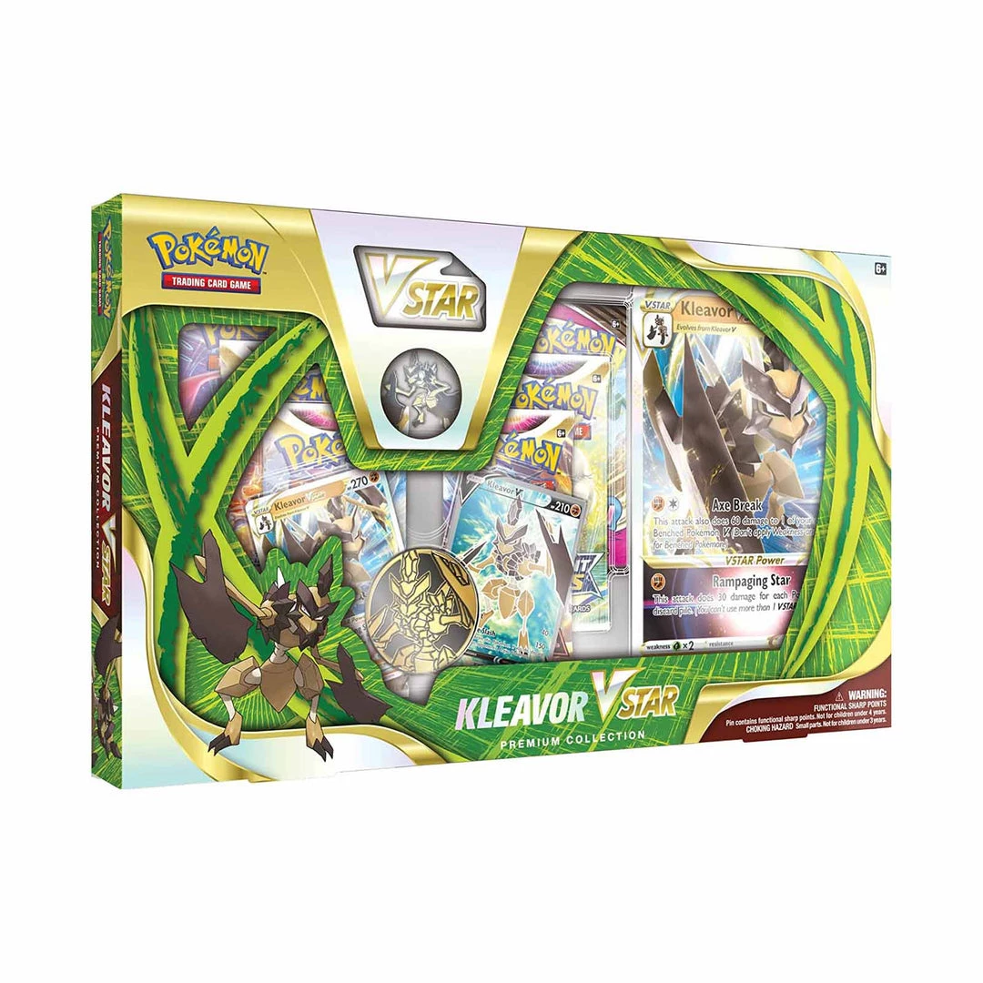 This set includes 1 etched foil promo card featuring Kleavor V, 1 etched foil promo card featuring Kleavor VSTAR, 1 oversize foil card featuring Kleavor VSTAR, 6 Pokémon TCG booster packs, 1 collector’s pin featuring Kleavor, 1 metallic coin featuring Kleavor, 1 acrylic VSTAR marker.