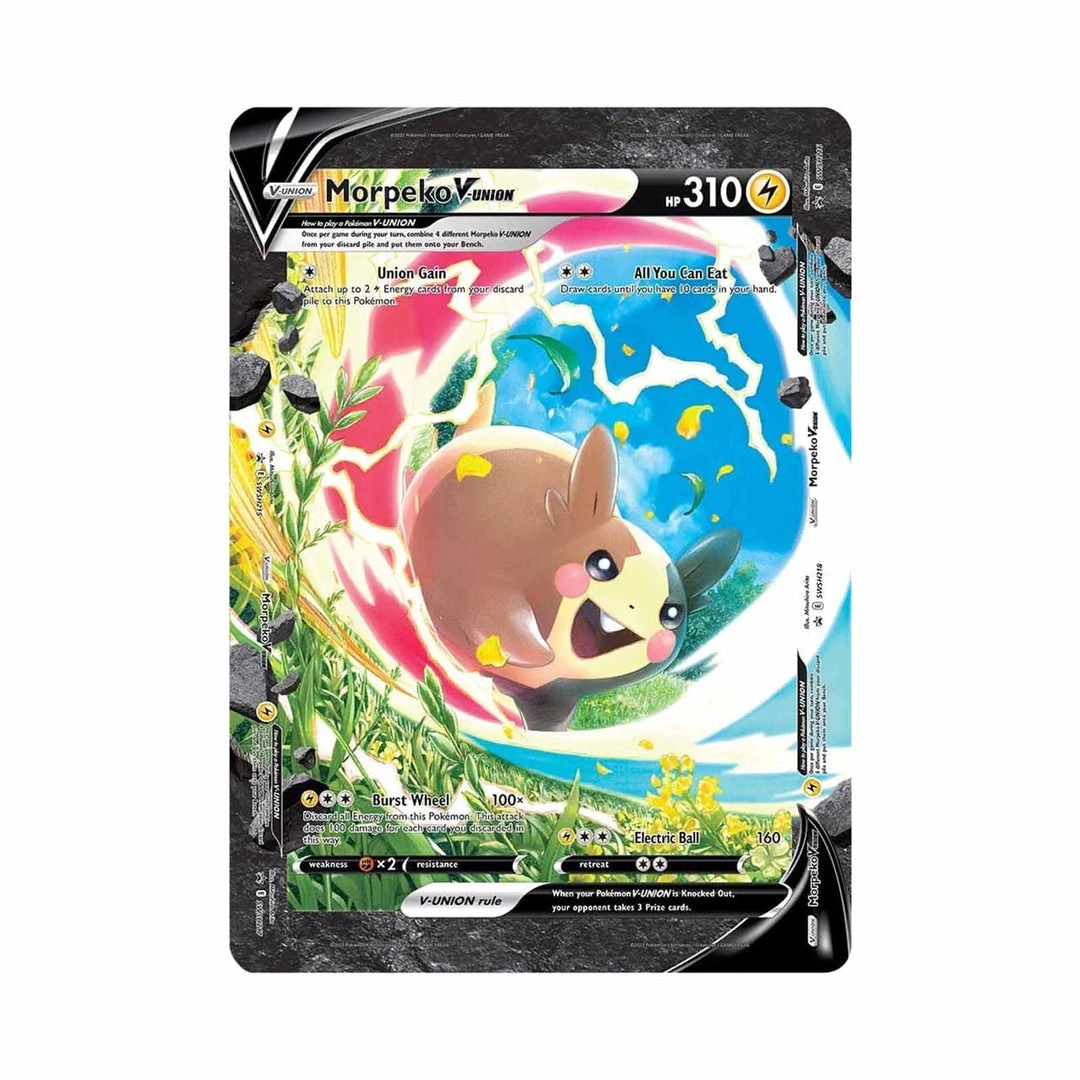 This set includes 4 foil promo cards that make up a single Morpeko V-Union, 1 oversize card featuring Morpkeo V-Union, 1 helpful Supporter Card featuring Professor Burnet, 4 Pokemon TCG boosters, and a code for Pokemon TCG Online.