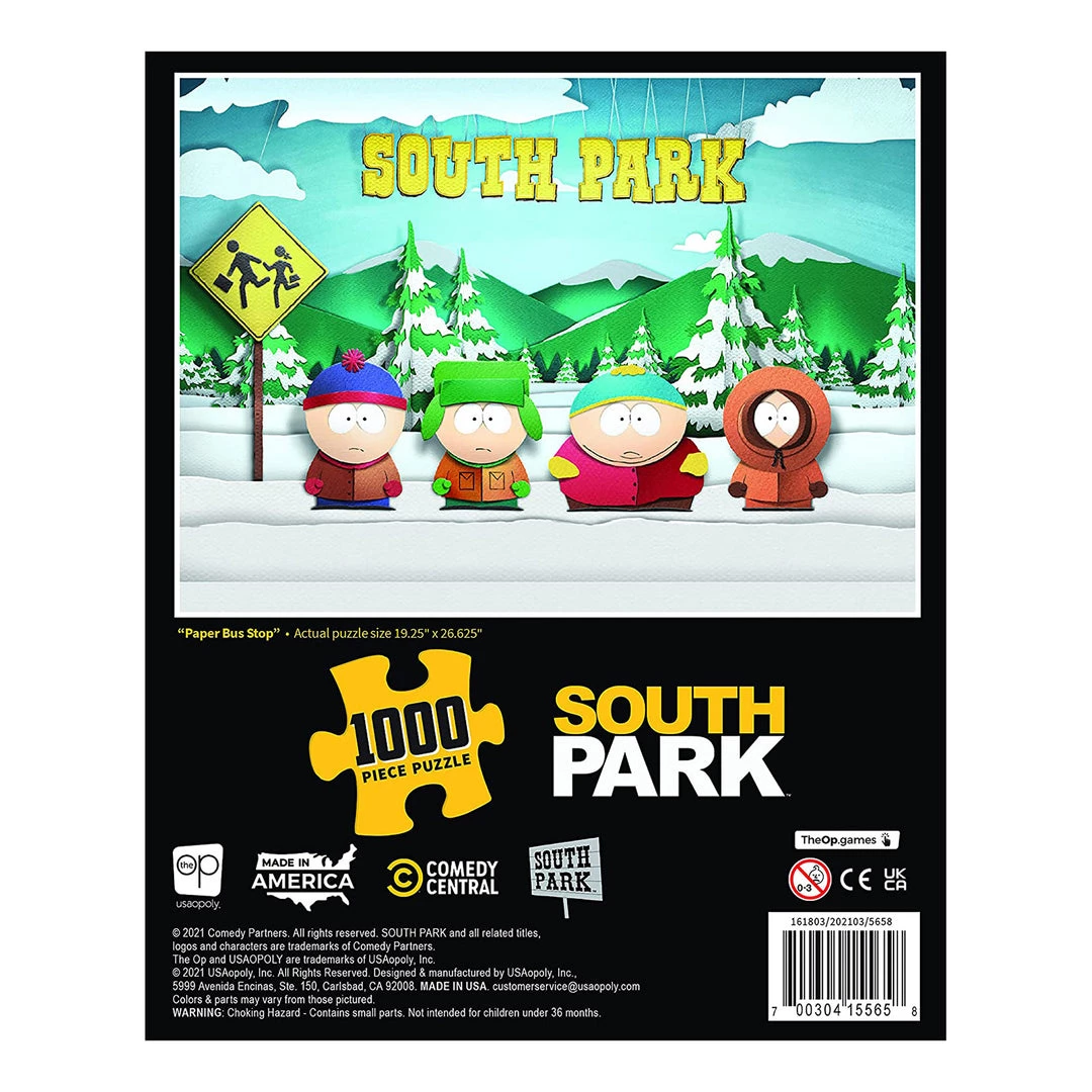This is a South Park Paper Bus Stop 1000 Piece Puzzle made produced by USAopoly.