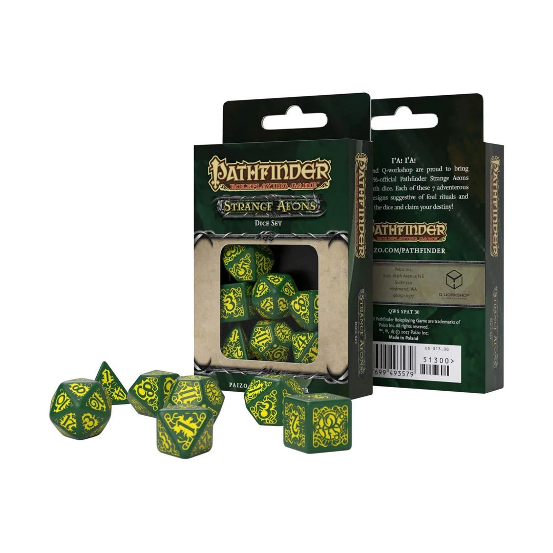 This is a Pathfinder Strange Aeons Roleplaying 7 Piece Dice Set made by the good people over at Q-Workshop.