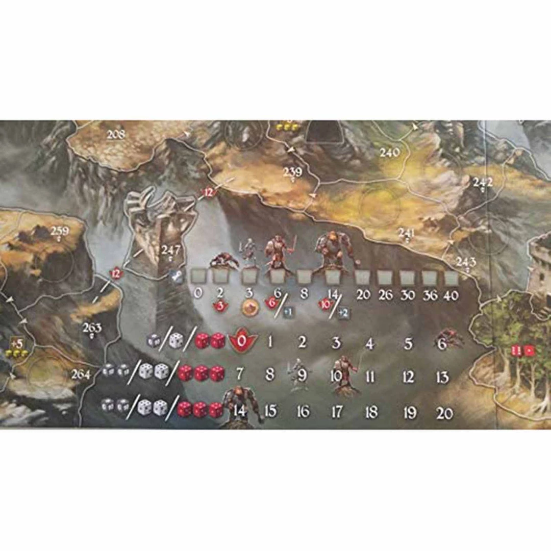 Contents: 1 Double-sided game board, 46 game figures, 4 hero boards, 1 equipment/battle board, 1 supply wagon, 1 camp, 121 additional cardboard pieces, 144 large legend cards, 33 small event cards, 22 dice, 9 wooden disks, 6 wooden cubes, 1 narrator game piece, 15 storage bags, 1 quick start guide, 1 reference manual